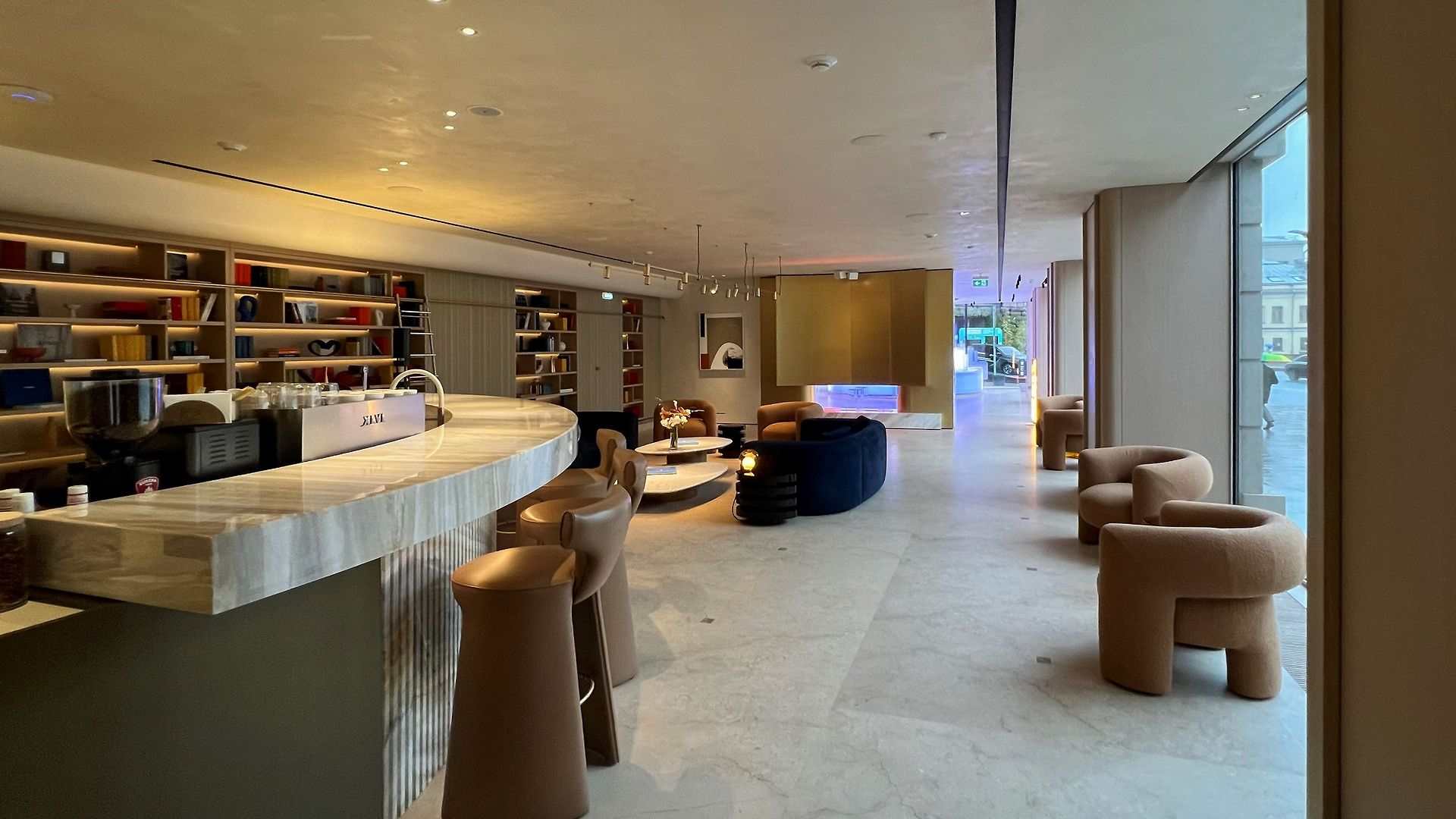 В отделке использованы латунь, мрамор и коллекционный арт. На первом этаже гостей встречает парадная зона ресепшена с мраморной стойкой, лаундж с библиотекой и баром авторских коктейлей.