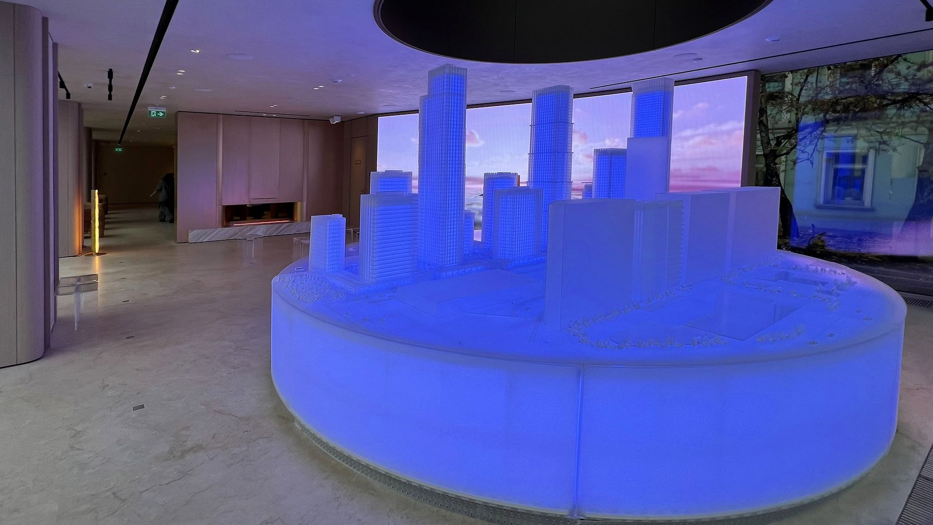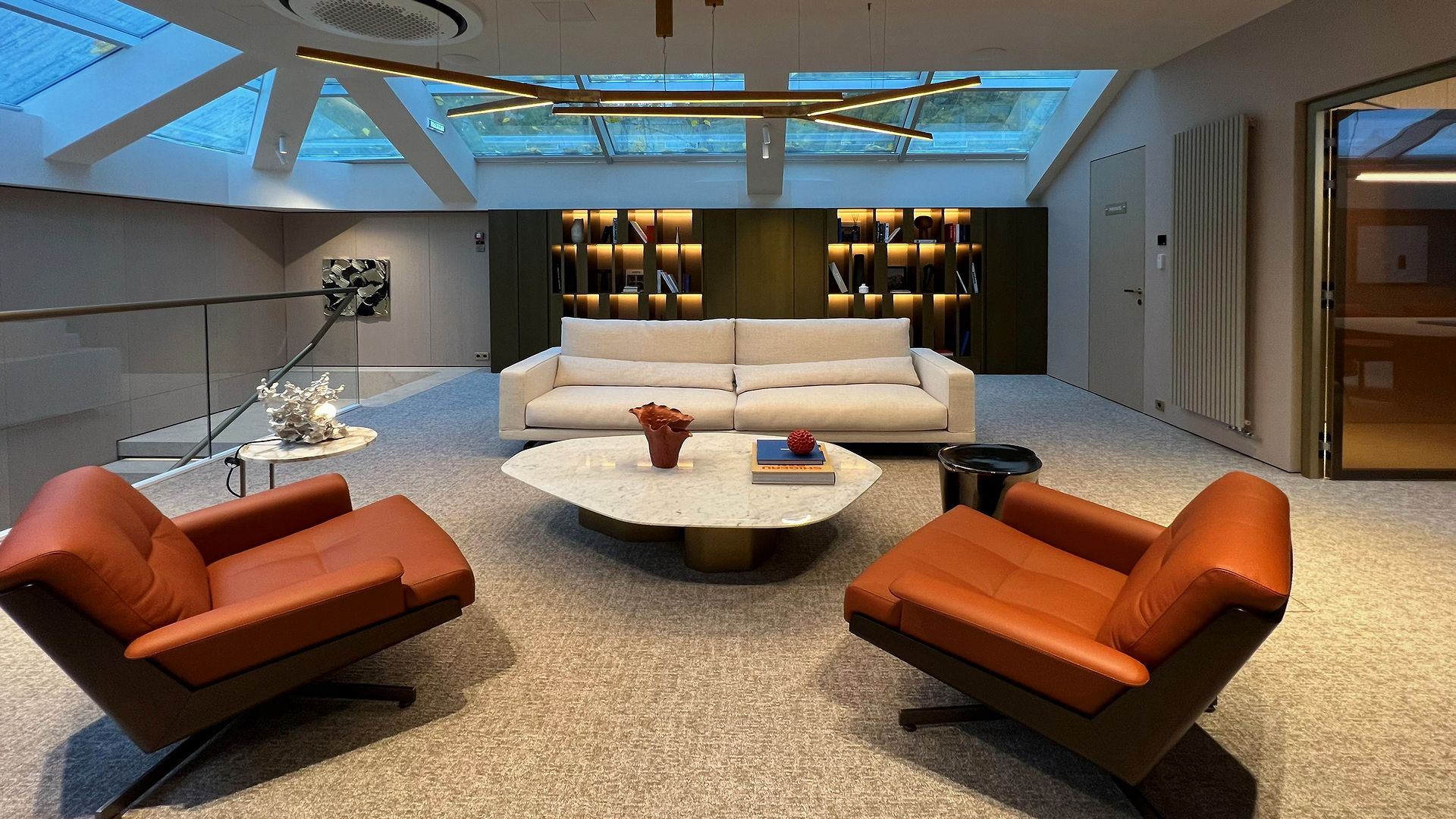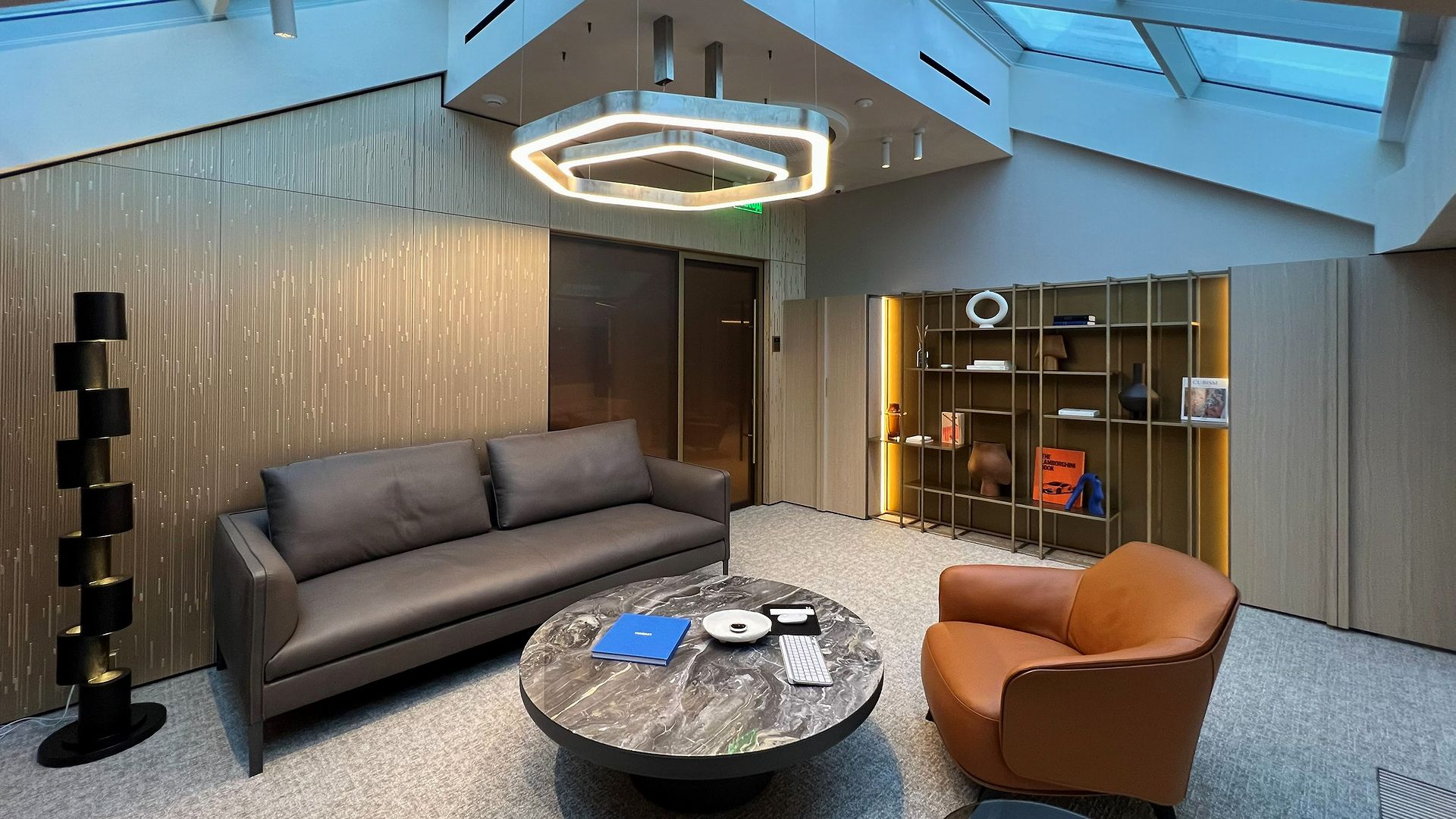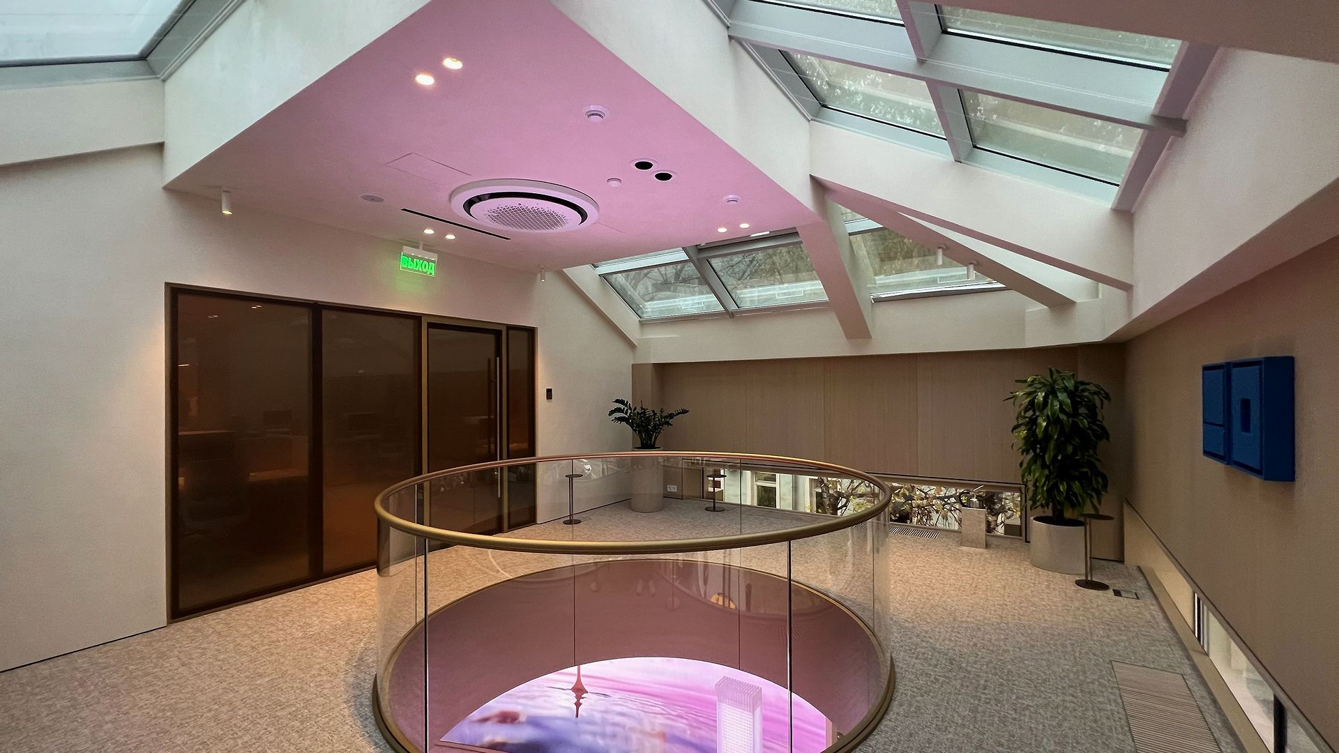 Второй уровень отведён под рабочие и переговорные зоны. Архитектурные и цифровые решения в офисе создают динамичную среду, идеально подходящую для презентаций и работы.