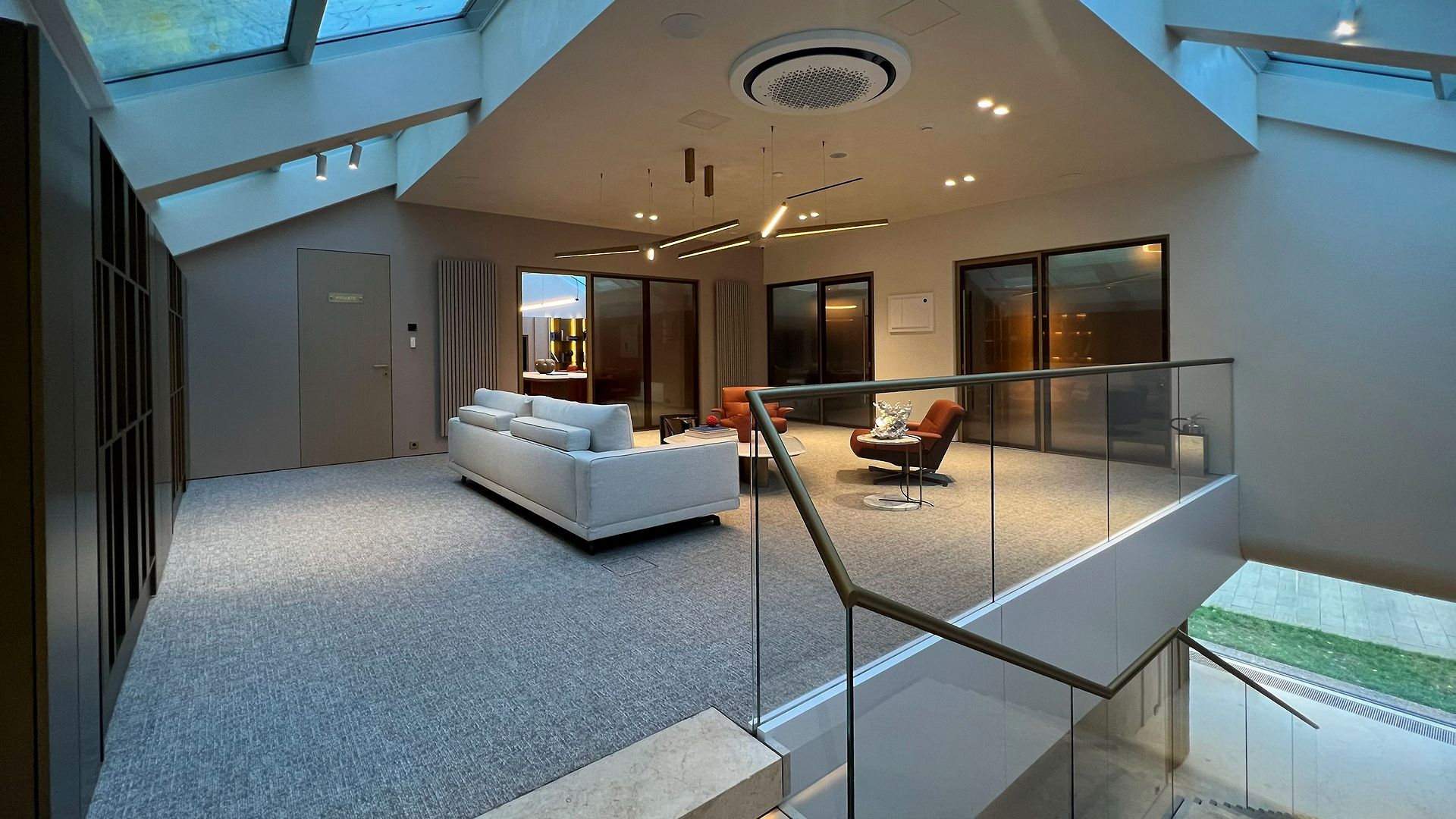 Фасадное освещение работает по городскому расписанию, а в проходных зонах свет включается автоматически благодаря датчикам присутствия ABB. Основное освещение внутри и снаружи реализовано по протоколу DALI, который интегрирован с системой KNX.